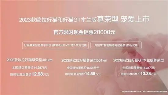 8月20日,欧拉第40万台整车在长城汽车泰州智慧工厂下线,同时,2023款欧拉好猫尊荣型、欧拉好猫GT尊荣型正式上市。其中,2023款欧拉好猫尊荣型售价区间为14.98-16.58万元,欧拉好猫GT尊荣型售价为15.38万元。在购车政策方面,官方将为购车用户提供限时现金优惠20000元,购买好猫尊荣型的用户免费享有价值2999元的V2L对外放电功能,购买好猫GT尊荣型的用户可享智能辅助驾驶选装包5折优惠。