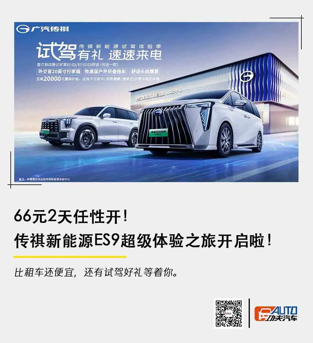 仅需66元,就能享受丝绸般顺滑的驾控,全家人都稳坐C位的大空间,2天任性开的舒适0焦虑出行,这样的传祺ES9超级体验之旅你怎么能错过!赶紧打开广汽传祺APP进行报名吧!