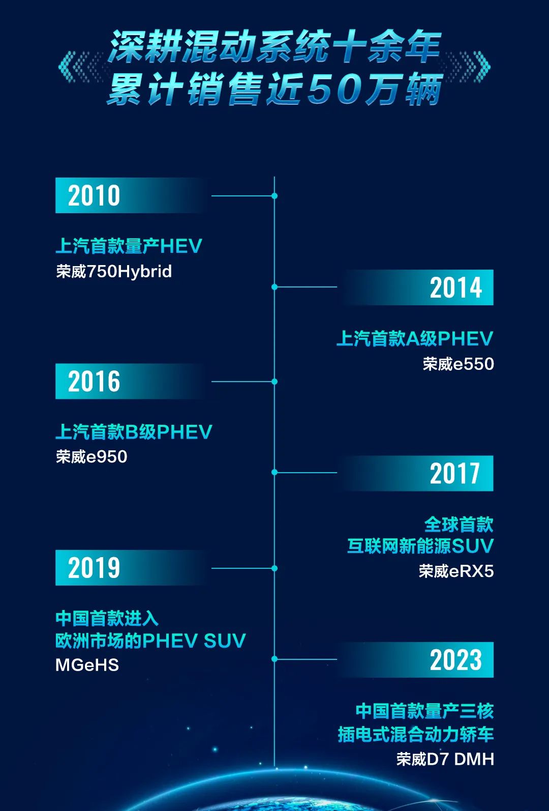 其实荣威这套DMH超级混动系统的推出时间相比其他自主品牌相对稍晚了,实际上荣威在新能源技术方面的研究是有很多的技术积累,比如早在2010年便提出了不同技术路径的探索,2013年就推出三核插电式混合动力(荣威e550),再到2016年,推出首款插电混动互联网SUV荣威eRX5,再到今年搭载DMH超级混动的荣威D7 DMH,技术层面不断迭代。