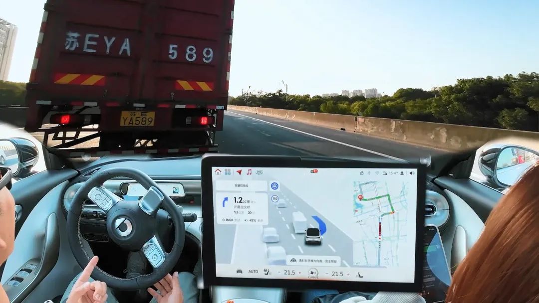 这还没完,第一次变道刚刚完成,系统马上又发起了第二次变道,而此时,我们被卡在两台大货车中间,车速一度降到0,但是就是在这种情况下,车辆的方向盘依然在往右转,在确认右后方没车之后,它果断给了一脚加速,chua的一下,就贴着前面大货车的屁股,变到了最右侧车道!这番操作,真的非常老司机。