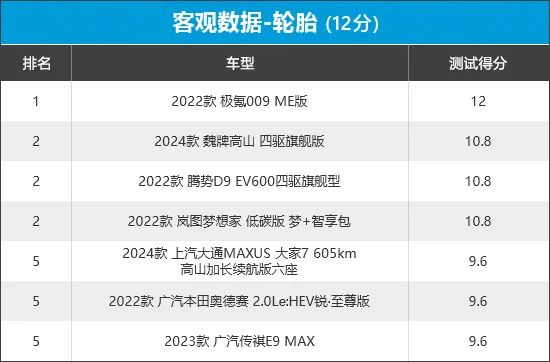 从榜单排名来看,唯有极氪009获得了满分,单条轮胎售价超过了1500元。而魏牌高山、腾势D9和岚图梦想家的单条轮胎售价在千元左右,均位列第二。相比之下,剩余的3款车型在此环节排名垫底。
