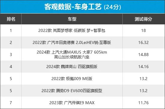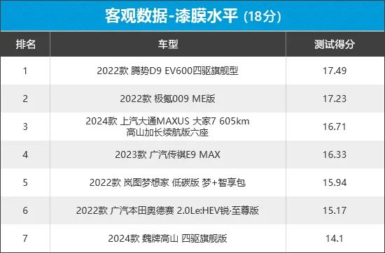从榜单中可以看出,腾势D9和极氪009这2款车型在此环节均得到17分以上的好成绩,整车的漆膜厚度和喷涂均匀性表现可圈可点。相比之下,魏牌高山在此环节表现不佳,失分主要原因在于发动机舱盖的漆膜厚度均值低于70μm,导致得分与另外6款车型存在一定差距。