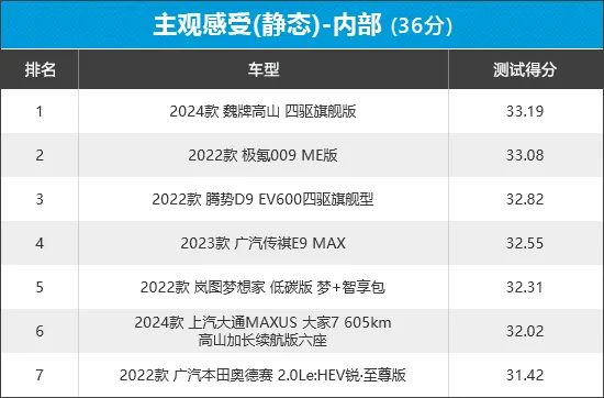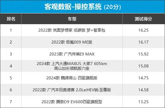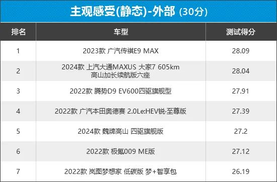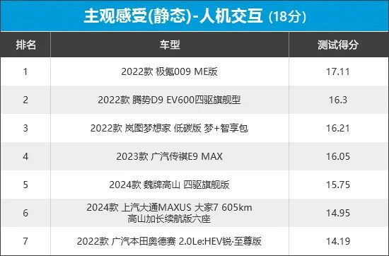 从榜单排名可以看出,7款车型在外部的主观评价中得分相差不大,其中广汽传祺E9以微弱的优势拔得头筹。排名末尾的岚图梦想家,失分的主要原因在于其未配备手动钥匙,缺少紧急状况下的应急手段。