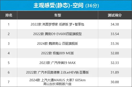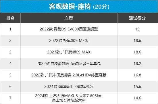从榜单排名来看,腾势D9以高分成绩登顶,其在主驾座椅调节行程和座垫长度测试环节均拿到满分。而得分最低的上汽大通MAXUS大家7主要失分在于,前排座椅座垫偏短和主驾座椅调节行程较短,对乘坐舒适性造成一定影响。