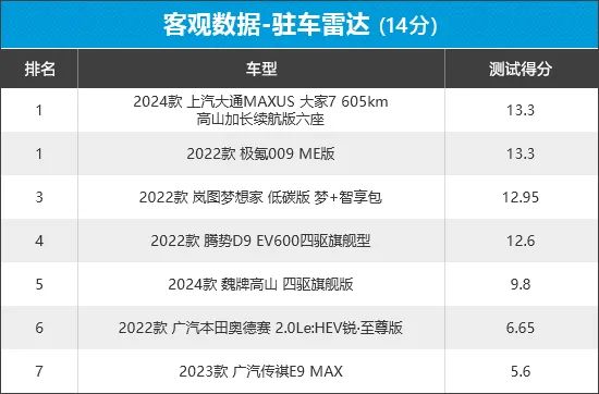 从榜单排名可以看出,上汽大通MAXUS大家7和极氪009以接近满分的成绩携手登顶,驻车雷达表现值得肯定。相比之下,广汽传祺E9排名再次垫底,且得分与其他车型差距较大,主要原因在于其前/后驻车雷达蜂鸣最远距离与障碍物距离过近,存在碰撞风险。