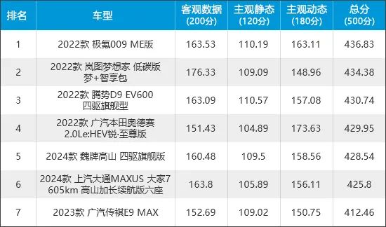 此次选取的7款车型均出自传统车企,其中有6款车型为自主品牌。从客观数据、主观静态和主观动态三个维度来看,7款车型表现各不相同。其中,极氪009凭借在三大维度的均衡表现,斩获冠军,其总分在车质网测试过的所有车型中处于中上游水平。此外,岚图梦想家在客观数据维度表现出色,得分排名第一位,车身工艺水平值得肯定。广汽本田奥德赛在主观动态维度表现出色,得分与其他6款车型拉开较大差距,以绝对优势获得第一名。相比之下,广汽传祺E9在三大维度中的失分较多,排名大多靠后,导致总排名垫底。