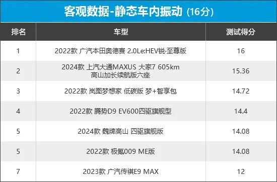 从榜单排名来看,广汽本田奥德赛以满分成绩夺冠,成功扳回一城,可见其非常注重车内驾乘人员的舒适性体验。而作为纯电车型的上汽大通MAXUS大家7在此环节的得分超过15分,表现同样值得肯定。相比之下,广汽传祺E9的整体表现逊色于其他6款车型,失分原因在于五个固定测试点在怠速和负载状态下的振动数值均明显偏高。