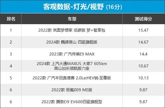 从榜单排名可以看出,广汽本田奥德赛以满分登顶,彰显传统合资品牌车型的硬实力,整体表现值得肯定。相比之下,广汽传祺E9在本轮测试中排名垫底,主要在防碰撞预警/主动刹车测试项目中失分较多。