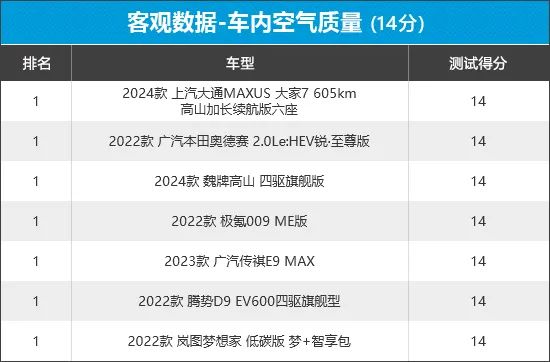 通过榜单排名可以看出,7款车型的车内均未检测出甲醛成分,都以满分成绩过关,可见各品牌对于车内空气质量非常重视。