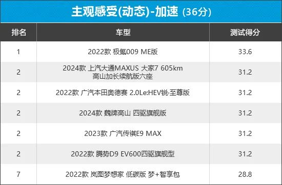 从榜单排名来看,极氪009以绝对领先优势获得第一名,与其他6款车型拉开一定差距。相比之下,岚图梦想家位于榜单最后一名,其在加速踏板脚感以及中段加速方面均有失分,表现中规中矩。