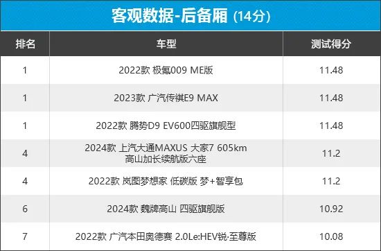从榜单排名来看,极氪009、广汽传祺E9和腾势D9并列榜单第一名。三者在后备厢开口面积、最大宽度、最小宽度和门槛高度四项测试中均拿到了满分,表现可圈可点。相比之下,广汽本田奥德赛在本轮测试中失利,其在后备厢最大宽度、最小宽度以及门槛高度这三个测试环节中失分较多。