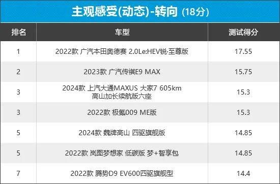 从榜单排名情况来看,广汽本田奥德赛以接近满分的成绩位列榜首,在6项测试中有5项都拿到了满分,表现值得肯定。相比之下,腾势D9在该测试环节表现不佳,最小转弯半径偏大成为失分的主要原因。
