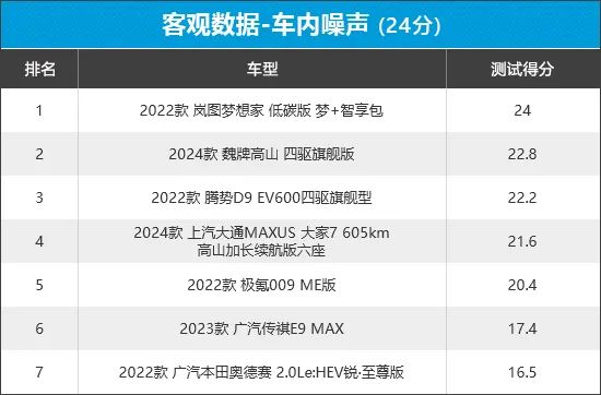 从榜单排名来看,岚图梦想家以满分的成绩夺得榜单冠军。相比之下,广汽本田奥德赛和广汽传祺E9在此环节得分排名靠后,且和其他5款车型差距较大,主要原因在于空调噪声项目失分较多,二者空调最高档噪声都在70dB左右,对于车内乘员舒适性会产生一定影响。