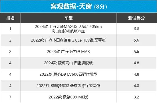 从榜单排名来看,上汽大通MAXUS大家7表现突出,可开启面积较大,整体表现好于其他6款车型。相比之下,极氪009在本环节中排名垫底。不仅天窗无法打开,天窗面积占比也稍逊色于榜单其他车型。