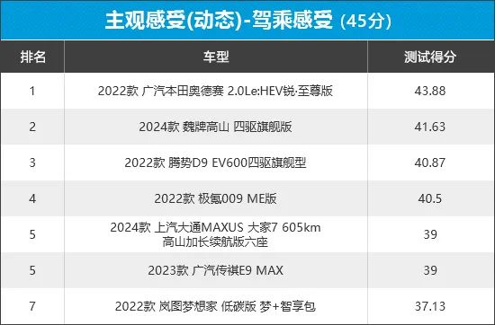 从榜单车型的得分来看,广汽本田奥德赛再次位列榜单第一名。相比之下,岚图梦想家的失分较多,主要体现在车辆行驶中通过减速坎时的垂直跳动较为明显,导致得分与其他6款车型拉开较大差距。