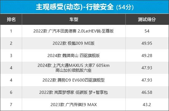 从榜单排名情况来看,广汽本田奥德赛以满分成绩轻松夺冠,整体表现可圈可点。相比之下,魏牌高山、广汽传祺E9和岚图梦想家的表现欠佳,得分携手垫底,这三款车型在制动感受的3个测试项目中均有失分。