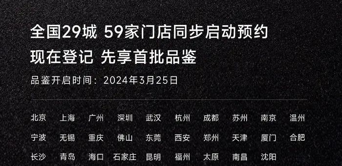 但是,小米汽车自己说的是,3月25日起在北上广深以及杭州、佛山、成都等全国29城59家门店开启首批品鉴。