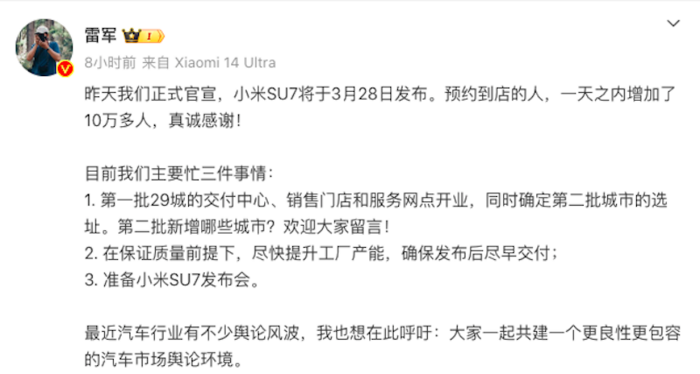 在3月12日,小米汽车官方正式发布预告,旗下首款车型SU7将会在3月25日开启全国首批品鉴,并将在3月28日正式上市。