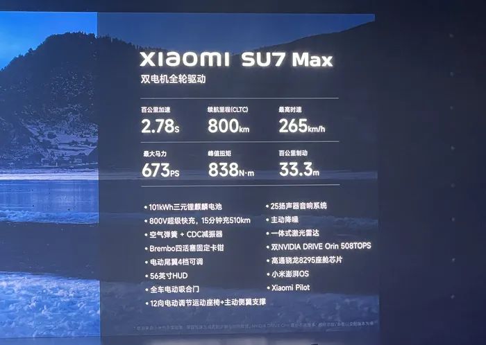 小米SU7 MAX版零百加速2.78秒,搭载101kWh三元锂电池,800V平台,CLTC续航800公里,搭载空气悬架+CDC减振器,有HUD/电吸门/激光雷达、双Orin-X芯片,可实现高速/城区领航智驾。搭载高通骁龙8295芯片,56英寸HUD、12向电动调节运动座椅+主动侧翼支撑、25扬声器音响系统。