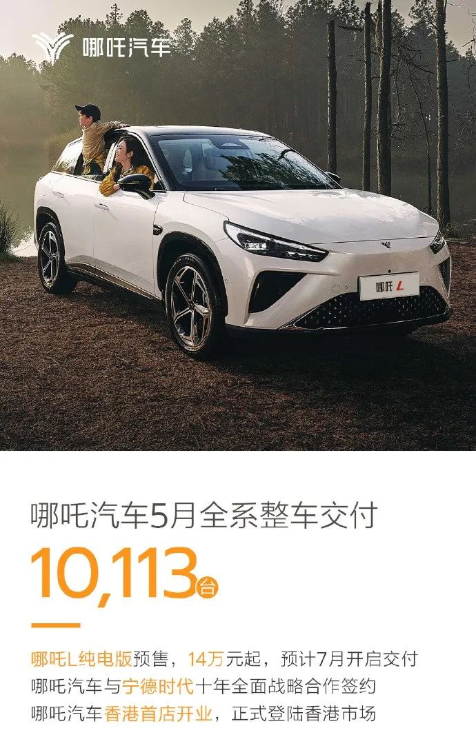 哪吒:5月交付10,113辆,1-5月累计43,564辆