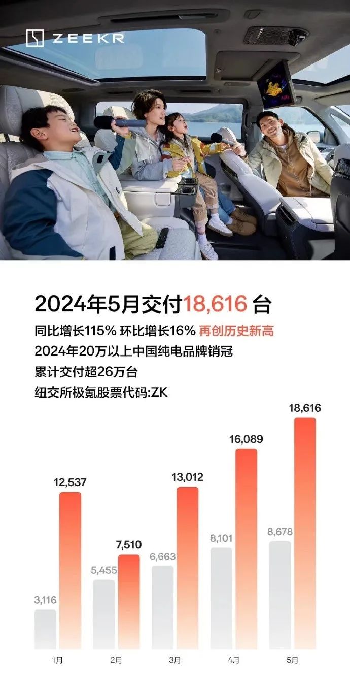 极氪:5月交付18,616辆,1-5月累计62,262辆