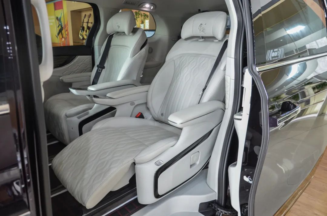一台MPV最重要的区域,自然是第二排。星海V9配备了双侧电滑门,采用2+2+3的布局,因此第二排采用的是两个独立航空座椅,整体舒适度在线,而且在靠背和头枕上也都有菱形纹格和Logo刺绣,视觉上会有一定的高级感。