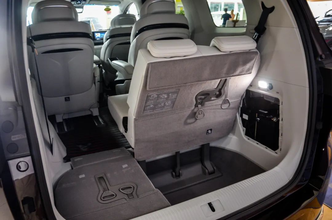 尽管星海V9的尾部设计偏向常规,但打开尾门立马有意外之喜。首先在第三排座椅正常打开的情况下,星海V9的尾箱居然还可以做到深度挖空,这对于一台插混的MPV而言着实不易。