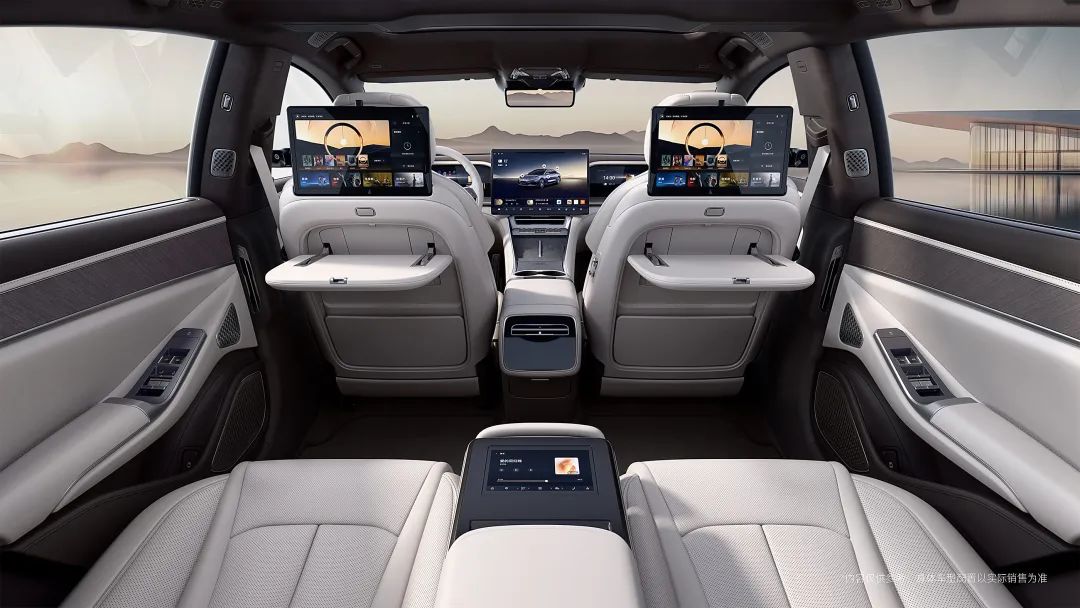 内饰方面,同样也是与腾势Z9GT基本一致,非常注重豪华氛围,配备了悬浮式中控屏、全液晶仪表、全新样式的四幅式方向盘、副驾驶娱乐屏等,不过新车采用的是电子怀挡杆,与腾势Z9GT有所不同。此外,后排方面,该车配备了后排娱乐屏、小桌板以及腿托支撑等,可以看出在乘坐舒适性方面有着更好的表现。
