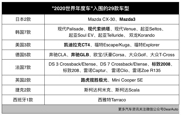 这次入围"2020世界年度车"评选的一共有29款车,其中欧系最多,占了17款; 韩系7款,美系3款,日系只有2款。 欧系当中,法国车入围最多,共有7款; 其次是德系,共5款; 英国和捷克各有2款,西班牙1款。 按品牌来分,现代、起亚、雷诺各有3款车型入围,是入围车型最多的汽车品牌。
