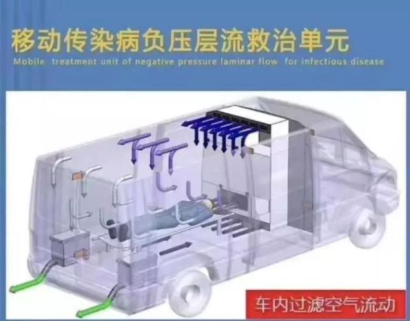 众所周知,目前能称得上最“健康”的一类车型便是负压式救护车,这也是如今向火神山和雷神山转移病人的专用医护车型。这种车型的“负压系统”可以让救护车内气压低于外界大气压,空气在自由流动时只能由车外流向车内,病员舱室内空气在排向大气前,会集中经高效过滤器(99.97%@0.3um)过滤。
