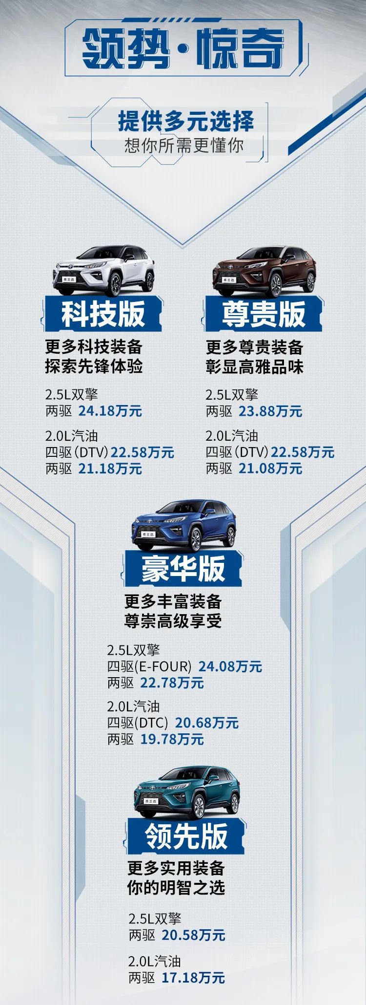 前段时间,丰田RAV4荣放一度传出需要加价提车的消息,但由于受到疫情的影响,估计其价格目前已回复到正常水平。然而,这次丰田威兰达以“更便宜、更高级”的姿态出现,无疑会给丰田RAV4荣放带来更多的压力。